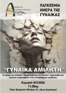 Συγκίνηση και σιωπή. «ΓΥΝΑΙΚΑ ΑΜΙΛΗΤΗ» Η σημερινή εκδήλωση για την Παγκόσμια Ημέρα της Γυναίκας άγγιξε βαθιά όλες και όλους όσοι βρέθηκαν κοντά μας. Τα μέλη