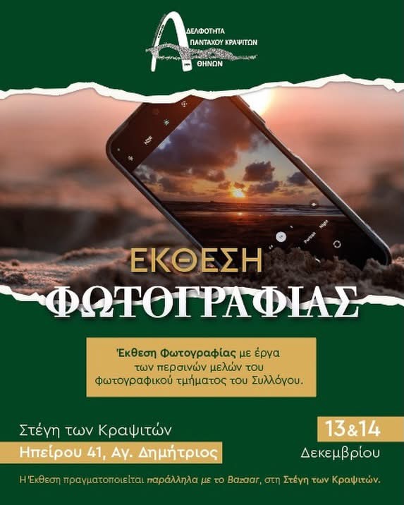 Στις 14-15 Δεκεμβρίου 2025 στη ΣΤΕΓΗ ΚΡΑΨΙΤΩΝ, η ερασιτεχνική ομάδα του εργαστηρίου φωτογραφίας 2024–2025, με την επίβλεψη της δασκάλας τους κας Πέπης Δανιήλ, παρουσίασαν ένα δείγμα της δουλειάς τους από έργα τους, τα οποία ομόρφυναν τον χώρο και ανέδειξαν τη δημιουργική έκφραση και τη ματιά των μελών μας.