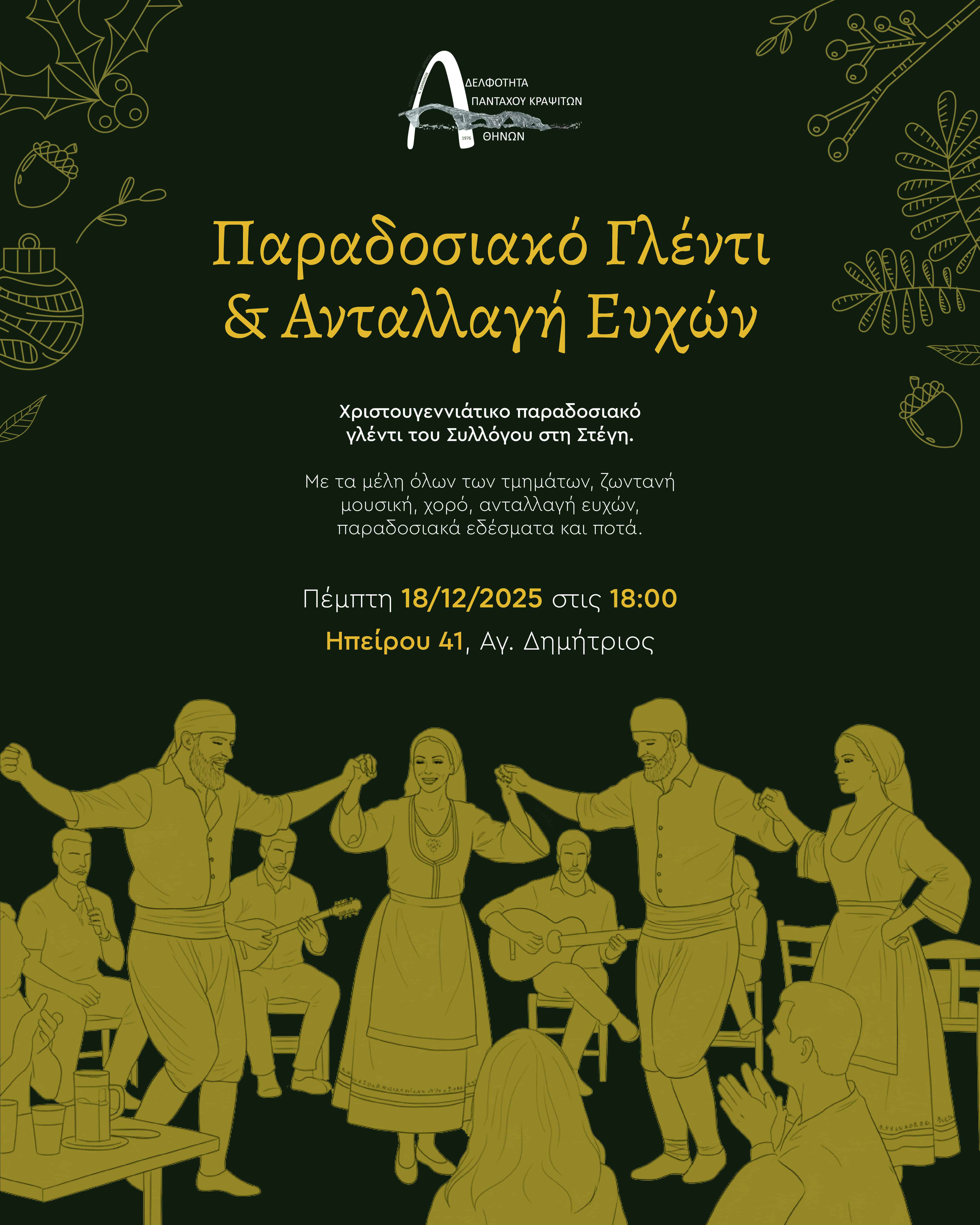 18/12/2025 Η τελευταία γιορτή των εργαστηρίων για το 2025 με ένα παραδοσιακό γλέντι με ηχοχρώματα από τα παρχάρια του πόντου και τις πλαγιές του Ζαγορίου και του πωγωνίου μέχρι τις κορυφές του Ψηλορείτη .