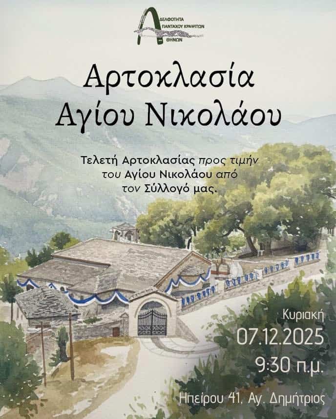 Η καθιερωμένη μας ετήσια αρτοκλασία, πραγματοποιήθηκε στην ΣΤΕΓΗ ΚΡΑΨΙΤΩΝ την Κυριακή 7 Δεκεμβρίου 2025, υπέρ του Ενοριακού Ναού του Αη Νικόλα της Κράψης Ιωαννίνων (που κτίστηκε το 1563) και λειτουργεί μέχρι και σήμερα, Η Αρτοκλασία είναι μία σύντομη, πανάρχαια ακολουθία της Ορθόδοξης Εκκλησίας. Γίνεται με πέντε άρτους, προς τιμήν του θαύματος του Χριστού με τους πέντε άρτους που χόρτασαν χιλιάδες ανθρώπους. Στην ουσία, είναι μια δέηση για την υγεία, τη σωτηρία και την ευλογία της κοινότητας. Κατά τα χρόνια της Οθωμανικής κυριαρχίας, η Ορθόδοξη Εκκλησία στην Ήπειρο (όπως και σε όλο τον υπόδουλο Ελληνισμό) αναδείχθηκε στον ακρογωνιαίο λίθο της επιβίωσης και της διατήρησης της εθνικής και πολιτισμικής ταυτότητας. Λειτουργώντας ως το επίσημα αναγνωρισμένο «Μιλέτ» (Millet, θρησκευτική κοινότητα), η Εκκλησία δεν ήταν απλώς θρησκευτικός θεσμός, αλλά κοινωνικός, πολιτικός και εκπαιδευτικός πυλώνας.