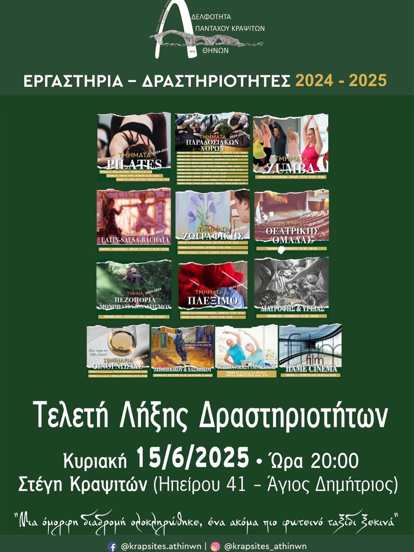 Την Κυριακή 15 Ιουνίου 2025 στον αύλειο χώρο της ΣΤΕΓΗΣ ΚΡΑΨΙΤΩΝ , η αυλαία έπεσε για άλλη μια δημιουργική χρονιά στον Σύλλογό μας, με μια αποχαιρετιστήρια γιορτή που την έκαναν μοναδική, τα μέλη μας.